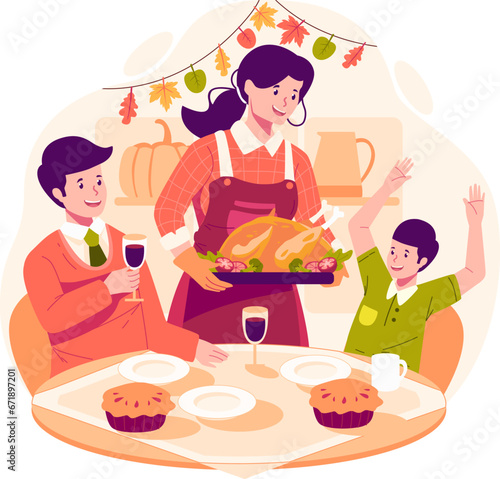 thanksgiving, autumn, celebrate, illustration, vector, celebrate, tradition, traditional, greeting, gratitude, pumpkin, turkey, chicken, holiday, seasonal, season, thanksgiving, november, people, cartoon, character, family, children, children, son, mother, father, vegetable, happy, celebration, thank, home, table, kitchen, feast, party, together, concept, banner, cheerful, cook, cooking, delicious, dining, dinner, eat, food, meal, meat