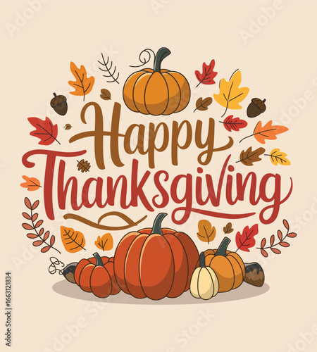 Happy Thanksgiving Typography with Pumpkins and Autumn Leaves Illustration