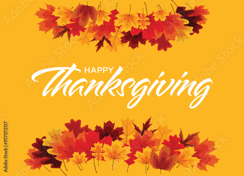 Happy Thanksgiving vector design with red, yellow, and orange fall maple leaves on orange background stock illustration