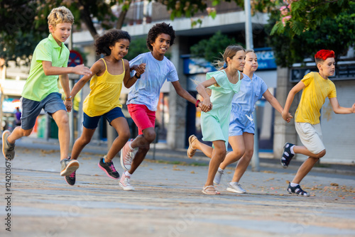 boy, girl, student, children, friends, group, children, togetherness, running, active, sport, game, playing, communication, socialising, interact, scene, greenery, summer, nature, city, street, outdoors, portrait, people, multiracial, ethnic, african, american, european, emotion, expressive, amity, happy, smiling, laughing, fun, enjoyment, cheerful, recreational, relaxing, holiday, vacation, leisure, lifestyle