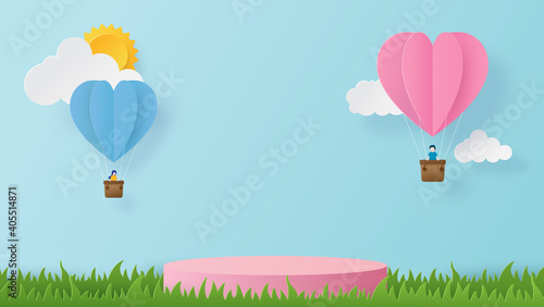 Happy valentines day banner with podium platform. Heart balloons with peoples joyful and podium to show product. Paper cut and craft style illustration