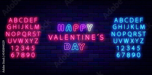 Happy Valentines Day neon inscription. Colorful typography. Light pink and blue alphabet. Vector stock illustration