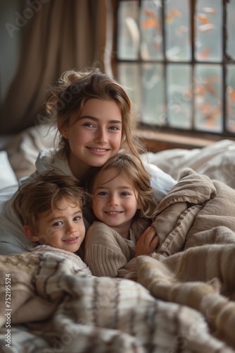 Happy Woman and Children Enjoying Quality Time Together in a Spacious Bed
