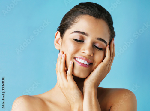Happy woman, beauty and makeup with skincare in satisfaction for facial on a blue studio background. Face of calm female person or model with smile in relax for cosmetics, dermatology or cosmetology