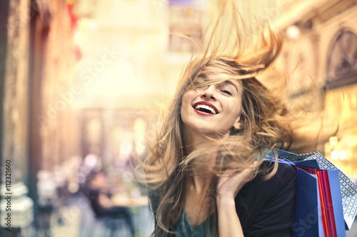 woman, business, hair, wind, smile, laugh, joy, happiness, bag, shopping, sale, shop, store, gallery, market, happy, smiling, fun, colours, blond, fashion, beautiful, beauty, white, caucasian, city, street, shopping centre, light, buy, spend, money, sack, travel, run, action, motion, freedom, success, feeling, portrait, face, young, person, people, blur, background