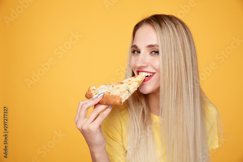 Happy woman eating tasty pizza for lunch in the yellow studio
