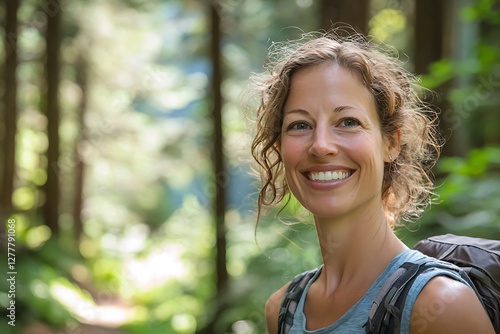Happy woman enjoying a scenic hike with a radiant smile
