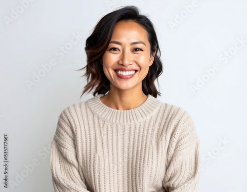 woman, happy, smile, confident, portrait, sweater, beige, hair, short, asian, beautiful, attractive, friendly, cheerful, positive, smiling, natural, light, background, studio, neutral, casual attire, warm, clothing, fashion, female, expression, face, dress, style, comfort, modern, joy, content, beauty, pleasant