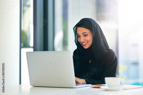 Happy woman, muslim and laptop with hijab at office for communication, email or connection. Islam, female person or employee with smile or scarf on computer for online browsing or web at workplace