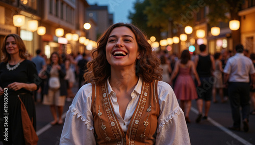 woman, smiling, street, night, festive, joy, happiness, crowd, light, celebration, lively, enjoyment, atmosphere, event, walking, casual attire, urban, laughter, excitement, interaction, summer, nightlife, community, culture, fashion, spontaneous, evening, togetherness, socialising, fun, joyfulness, city, resident, tied-up, beautiful, scenic, youthful, connection, friends, people, emotional, activity, vibrant, warm