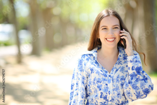 Happy woman talking on phone in a park with copy