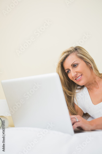 Happy woman typing on a laptop lying on her bed