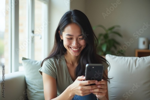 Happy woman using smartphone at home, online shopping, natural light