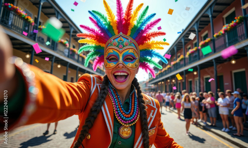 Happy woman wearing a mask on the street during the Mardi Gras carnival. Street artist in a national headdress with feathers