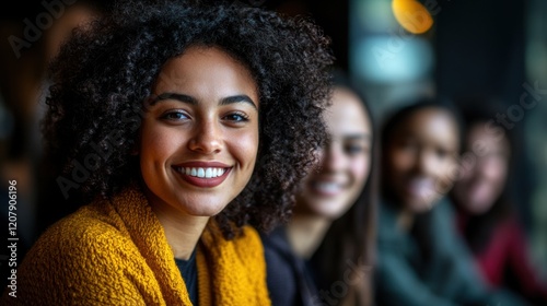 woman, curly hair, smile, happiness, casual attire, friends, portrait, indoor, lifestyle, joy, emotion, diversity, confidence, beauty, expression, people, relaxation, warmth, connection, youth, cheerful, sitting, natural, positive, lighting, candid, social, fashion, closeup, atmosphere, enjoyment, scene, personality, authenticity, engagement