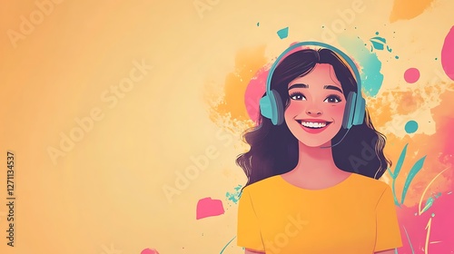 woman, girl, happy, smiling, earphones, music, listening, audio, colourful, vibrant, background, illustration, portrait, cheerful, joyful, young, female, style, beauty, fashion, art, design, digital, graphic, summer, fun, energy, positive, mood, expression, face, hair, teal, yellow, orange, pink, abstract, paint, splash, modern, carefree, relax, peace, calm