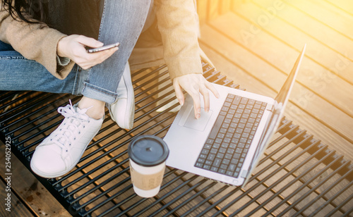 woman, happy, student, computer, smartphone, laptop, girl, phone, young, job, using, park, outdoors, female, cyberspace, smiling, urban, summer, person, lifestyle, hipster, beautiful, success, casual attire, city, online, outside, fashion, technology, background, looking, searching, adult, working, mobile, wireless, day, device, education, mobile phone, communication, coat, work, business, excited, shopping, hot drink, break, wooden
