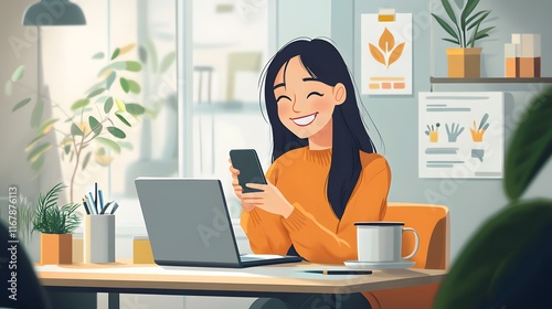 woman, happy, smiling, working, home, office, laptop, computer, phone, smartphone, desk, table, mug, hot drink, plant, green, orange, sweater, modern, interior, design, style, illustration, artwork, digital, art, graphic, cosy, comfortable, relaxed, peaceful, productive, technology, communication, connection, sunshine, light, bright, day, room, chair, creative, stylish, workspace