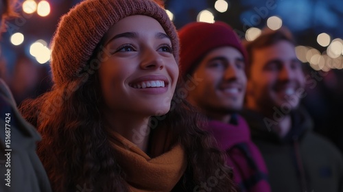 Happy young adults at outdoor event, smiling and looking towards stage.