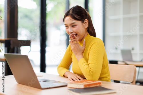 Happy young Asian business woman celebrating success at work in office looking at laptop excited about financial trading growth, goals achievement good online results, screaming yes watching game.