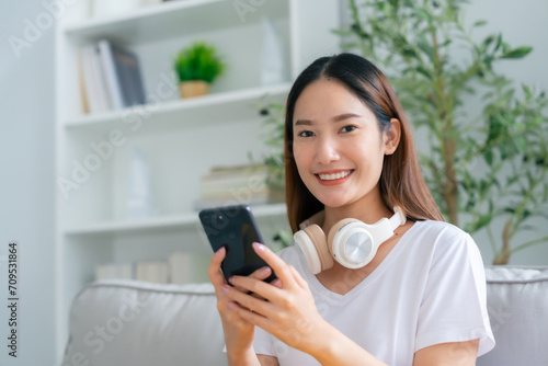 Happy young asian woman wearing headset and relaxing on comfortable couch at home, texting messaging on smartphone, smiling girl use cellphone chatting, online shopping at home, video call