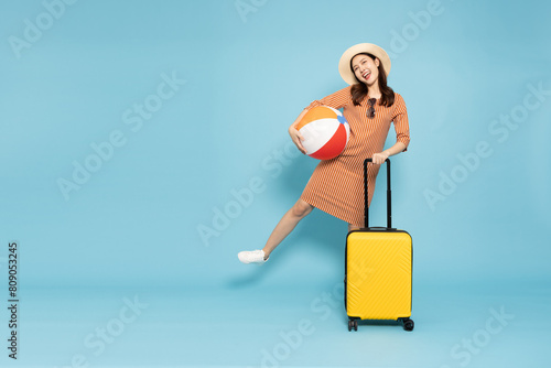 Happy young Asian woman traveler with luggage and holding beach ball isolated on sky blue background, Tourist girl having cheerful holiday trip concept, Full body composition