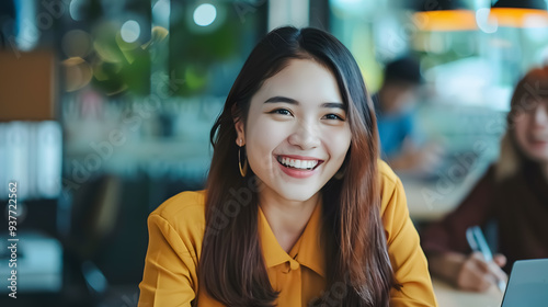 Happy young businesswoman sitting at a desk and communicating during a meeting.