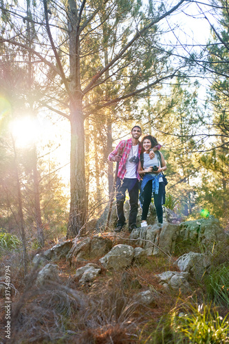 happy, young, couple, hike, sunny, wood, woman, man, adult, boyfriend, girlfriend, together, husband, wife, hiker, bonding, smile, enjoy, enjoyment, front, racked, lifestyle, vacation, holiday, love, affection, forest, tree, binocular, camera, weekend, get-away, nature, carefree, freedom, exploration, explore, active, healthy, recreation, adventure, outdoors, day, people, 2, pair, low angle, lens flare, travel, traveler