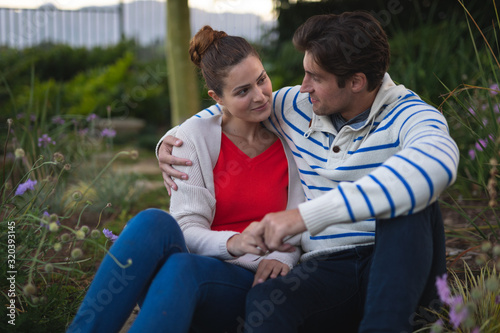 people, real people, domestic life, lifestyle, free time, leisure, relaxing, happy, enjoying, couple, together, closeness, interact, romantic, calmness, landscape, grass, summer, spring, path, plant, nature, holding hands, sitting, casual clothes, embracing, talking, smiling, flower, weekend, love
