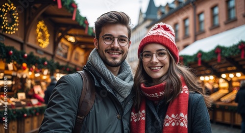 Happy young couple in Christmas market with festive stalls background portrait photo
