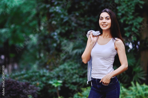 Happy young girl holding shirt in her hands in sleeveless t-shirt