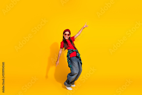 Happy young girl posing playfully in stylish clothing against a vibrant yellow studio background