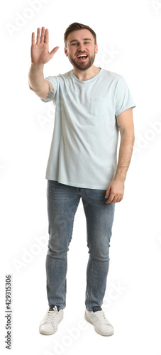 Happy young man waving to say hello on white background