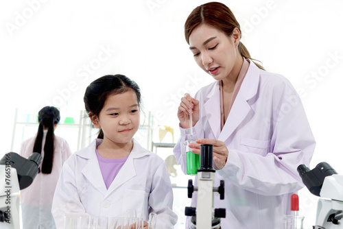 Happy young scientist kid girl in lab coats using lab equipment for study in school laboratory. Asian female teacher teaching schoolgirl child to do science experiments. Kid learning science education