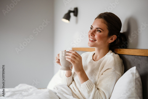 woman, female, girl, person, people, house, home, beautiful, tea, relax, cup, morning, happy, drink, relaxation, sitting, young, hot drink, caucasian, bed, holding, comfort, rest, lady