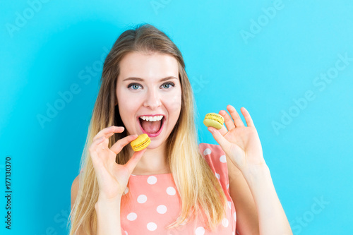 woman, woman, girl, cookie, food, eating, beautiful, female, beauty, happy, smile, pretty, cute, attractive, young, portrait, face, adult, lady, people, person, caucasian, white, high-coloured, isolated, background, blue, pink, casual attire