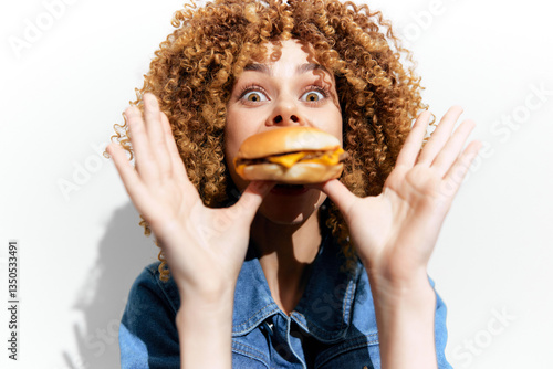 woman, happiness, hamburger, food, curly hair, excitement, joy, lifestyle, bright, playful, white background, casual attire, meal, nourishment, fast food, eating, delicious, summer, colourful, carefree, snack, tasty, vegetarian, vibrant, fun, expression, enjoyment, social, youth, epicure, culinary, appetising, satisfaction, portrait, beauty, fashion, modern, trendy, healthy, refreshment, cookery, indulgence, smiling, brunch, cheerful, culinary arts, snack food