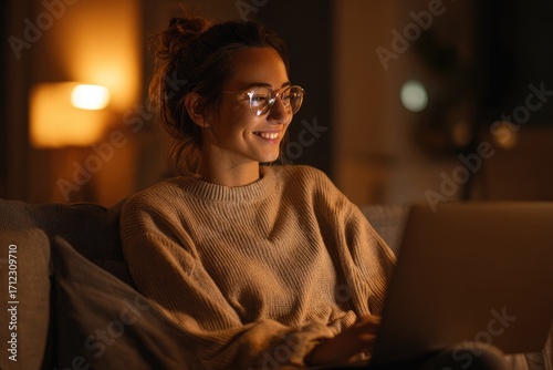 Happy young woman with glasses relaxing on sofa using laptop at night.