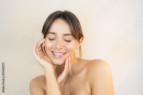 Happy Young Woman With Glowy Skin Eyes Closed Touching her Face with Flawless Healthy and Bright No-Makeup Makeup Look