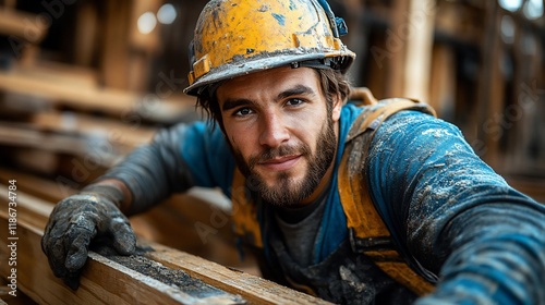 men at work, construction, timbering, wood, timber, beam, hard hat, helmet, beard, man, male, dust, dirt, grime, glove, hand, job, site, building, industry, carpenter, craftsman, labor, professional, occupation, safety, gear, equipment, blue, overall, serious, focused, determined, strong, powerful, skilled, experienced, confident, portrait, close, up, texture, detail, grit, passion, dedication
