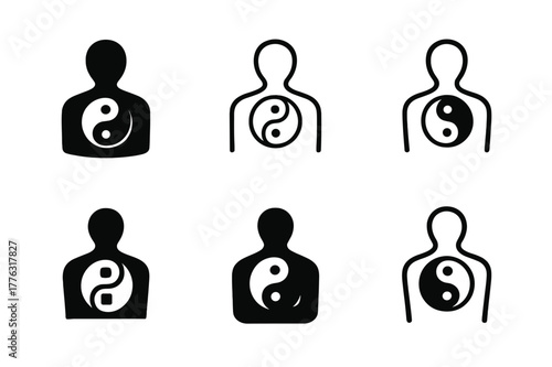 harmonious, logotype, variation, mind, body, connection, set, balanced, yin, yang, within, person, outline, icon