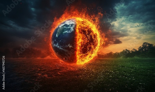 Harsh reality of climate change, depicted by a burning globe under a fiery red sky on one side, contrasted with a lush, green environment on the other, symbolizing the urgent need, Generative AI