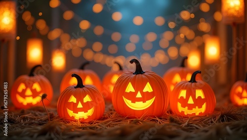 Harvest Festival theme, A vibrant celebration scene with glowing pumpkins, golden wheat, and sparkling lanterns.