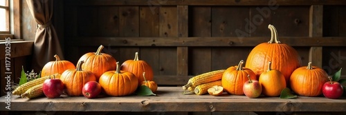 Harvest scene in a barn with a table filled with pumpkins, apples, and corn, harvest, farmhouse, pumpkin