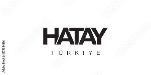 Hatay in the Turkey emblem. The design features a geometric style, vector illustration with bold typography in a modern font. The graphic slogan lettering.