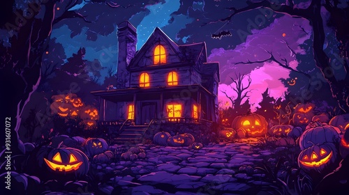 Haunted Abandoned House in Dark Spooky Halloween Forest with Glowing Pumpkins and Bats