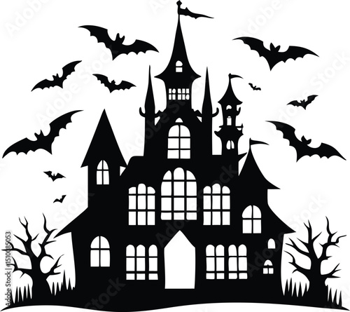 halloween, castle, haunted, house, skittish, bat, silhouette, night, scarey, horror, dark, gothic, mystery, creepy, evil, architecture, building, fantasy, design, illustration, graphic, isolated, white, background, tree, moon, eerie, fear, holiday, october