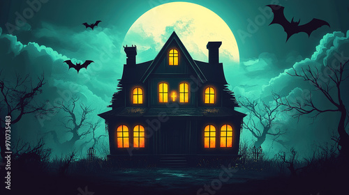 Haunted house and castle at Halloween night with eerie glowing windows, bats flying in the sky and a full moon casting a mysterious glow in the background.