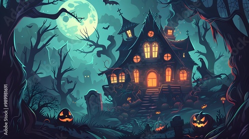 "Haunted House and Witch Flying Over Full Moon – Halloween Vector"