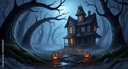 Haunted House Fronted by Foggy, Carved Pumpkin Lane and Tangled Blue Forest